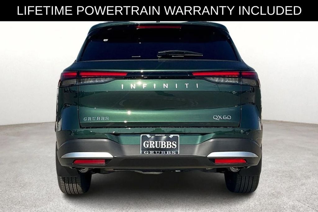 Recent Arrival! Certified. Grubbs INFINITI offers this Market Priced Pre-Owned 2026 INFINITI QX60 LUXE in Deep Emerald with a premium Graphite interior. Fully inspected and all Eligible Vehicles are backed by our exclusive Grubbs Lifetime Powertrain Warranty, it comes loaded with features including Cargo Package (Cargo Blocks, Cargo Mat, Cargo Net, Clear Rear Bumper Film, and Medic Kit), INFINITI Certified Pre-Owned Certified, 16 Speakers, 3rd row seats: bench, 4-Wheel Disc Brakes, ABS brakes, Air Conditioning, Alloy wheels, AM/FM radio: SiriusXM with 360L, Anti-whiplash front head restraints, Apple CarPlay/Android Auto, Auto High-beam Headlights, Auto tilt-away steering wheel, Auto-dimming door mirrors, Auto-dimming Rear-View mirror, Automatic temperature control, Bose Performance Series 17-Speaker Sound System, Brake assist, Bumpers: body-color, Climate Controlled Front Bucket Seats, Delay-off headlights, Driver door bin, Driver vanity mirror, Dual front impact airbags, Dual front side impact airbags, Electronic Stability Control, Emergency communication system: INFINITI InTouch, Floor Mats with Bench Seats on 3rd Row Tray, Four wheel independent suspension, Front anti-roll bar, Front Bucket Seats, Front Center Armrest, Front dual zone A/C, Front reading lights, Fully automatic headlights, Garage door transmitter: HomeLink, Heated door mirrors, Heated front seats, Heated rear seats, Heated steering wheel, Illuminated entry, Knee airbag, Leather Shift Knob, Leather steering wheel, Literature Kit, Low tire pressure warning, Memory seat, Navigation system: Google Built-in, Occupant sensing airbag, Outside temperature display, Overhead airbag, Overhead console, Panic alarm, Passenger door bin, Passenger vanity mirror, Power door mirrors, Power driver seat, Power Liftgate, Power moonroof: Panoramic, Power passenger seat, Power steering, Power windows, Premium Paint, Radio data system, Radio: Klipsch Premium Audio System, Rain sensing wipers, Rear air conditioning, Rear anti-roll bar, Rear reading lights, Rear seat center armrest, Rear side impact airbag, Rear window defroster, Rear window wiper, Reclining 3rd row seat, Remote keyless entry, Security system, Speed control, Speed-sensing steering, Speed-Sensitive Wipers, Splash Guards, Split folding rear seat, Spoiler, Steering wheel memory, Steering wheel mounted audio controls, Tachometer, Tailorfit-Appointed Seating Surfaces, Telescoping steering wheel, Tilt steering wheel, Traction control, Trip computer, Turn signal indicator mirrors, Variably intermittent wipers, Ventilated front seats, and Wheels: 20 x 8J Machined Aluminum Alloy. 2026 INFINITI QX60 LUXE 4D Sport Utility FWD 2.0L I4 PDI Turbocharged DOHC 16V 268hp 9-Speed Automatic Deep Emerald Upgraded Wheel Package.